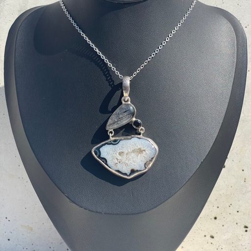 View full detailsAgate Druzy with Tourmalinated Quartz and Obsidian Pendant