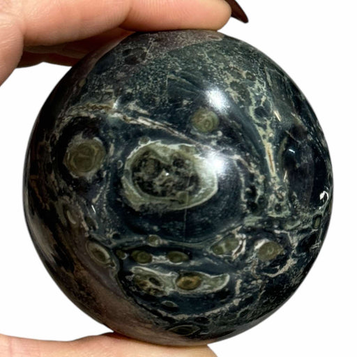 This Kambaba Jasper Sphere showcases the stone’s distinctive green and black patterns, offering a visually captivating and grounding presence. Know...